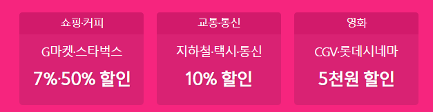 앞서 소개했던 것과 같이 나의 주력카드는 SC은행에서 발행하는 BC카드 플마(플러스마일, Plus mile)입니다. 그러다가 생활고정비(통신비, 가스비, 전기세, 대중교통)을 커버할 수 있는 카드가 무엇이 있을까 인터넷을 찾으며 계속 비교하다가 결국에는 삼성카드 탭탭오(TaptapO)를 신청하게 되었습니다. 그리고 플러스마일 카드의 단점이 5천원 미만의 결제에 대해선 마일리지가 쌓이지 않기 때문에 5천원 미만의 소액결제용 카드도 필요했습니다. 거기다가 지금 저는 LG U+를 통신사로 쓰고 있고 VVIP라서 매달 포인트로 영화표를 살 수 있습니다.(12000원을 7000포인트에 살 수 있습니다. VVIP에게 주어지는 포인트는 10만 포인트고 영화외에 쓸 곳이 없어서 매달 영화를 보는 것이 좋습니다.) 하지만 영화를 보통 혼자 보지 않기 때문에 영화 할인도 가능한 신용카드가 있었으면 좋겠다고 생각했습니다. 그래서 저의 고정비 지출은 앞서 말한 생활고정비도 있지만 영화표를 사는 것도 있기 때문에 영화할인도 카드 선택을 하는데 고려대상이 되었습니다.