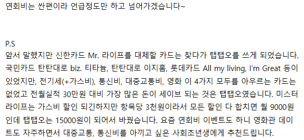 국민카드 탄탄대로 biz. 티타늄, 탄탄대로 이지홈, 롯데카드 All my living, I'm Great 등이 있었지만, 전기세(+가스비), 통신비, 대중교통비, 영화 이 4가지 모두를 아우르는 카드는 없었고 전월실적 30만원 대비 가장 많은 돈이 세이브 되는 것은 탭탭오였습니다. 미스터라이프는 가스비 할인 되긴하지만 항목당 3천원이라서 모든 할인 다 합치면 월 9000원인데 탭탭오는 15000원이 되어서 바꿨습니다. 요즘 연회비 이벤트도 하니 영화관 데이트도 자주하면서 대중교통, 통신비를 아끼고 싶은 사회초년생에게 추천드립니다.