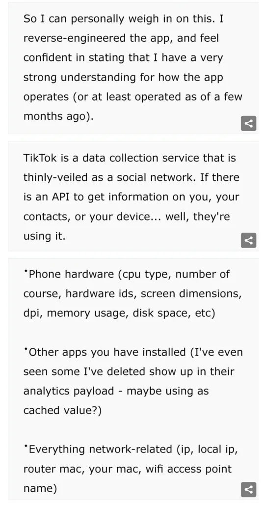 틱톡은 과거 해킹앱이라는 논란이 많았는데, 요즘들어서 거의 확실시 된 것 같습니다. 아래는 어떤 엔지니어가 작성한 글인데요.