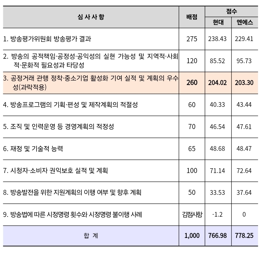 심사위원회 평가 결과, 두 회사 모두 기준 점수를 넘겼으며, 특히 공정거래 관행 정착과 중소기업 활성화 기여 항목에서 높은 평가를 받았네요.