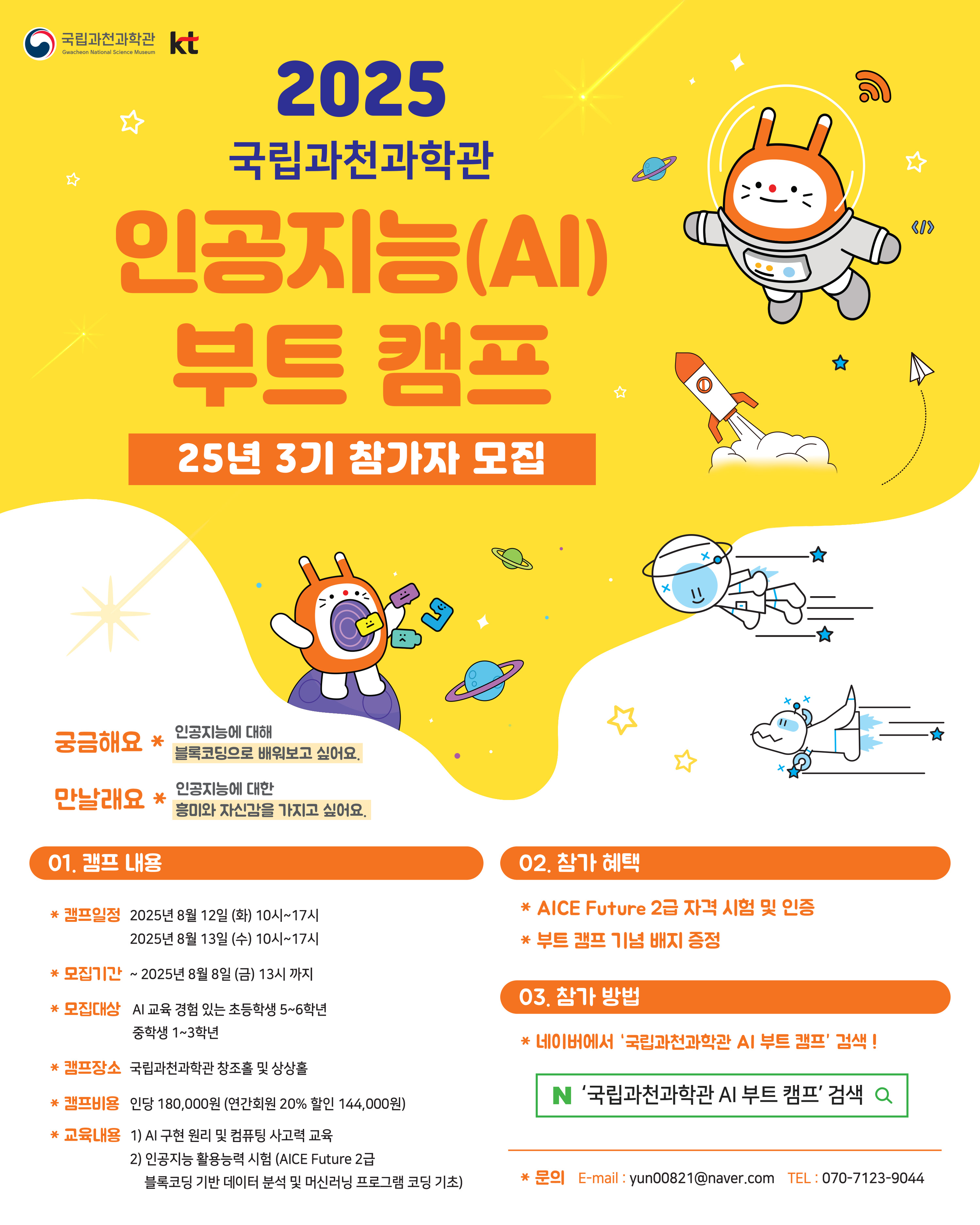 국립과천과학관과 KT가 공동 주최하는 2025 인공지능(AI) 부트 캠프 (25년 3기 참가자 모집)