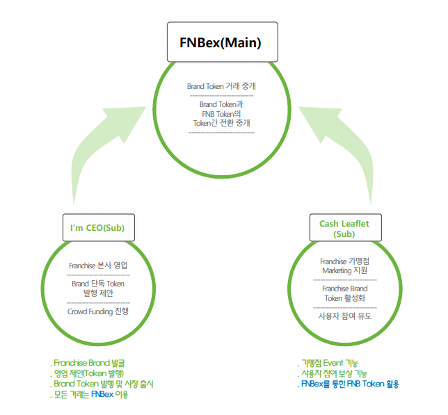 FNB는 탈중앙화 거래소를 기반(FNBex) 를 중심으로 프랜차이즈 브래드 토큰을 발행하여 시장유통을 하기 위해 '나도 사장님'의 창업 플랫폼과 Reward App '캐시리플랫(Cash Leaflet)과 함께 생태계를 만들어 갑니다.
