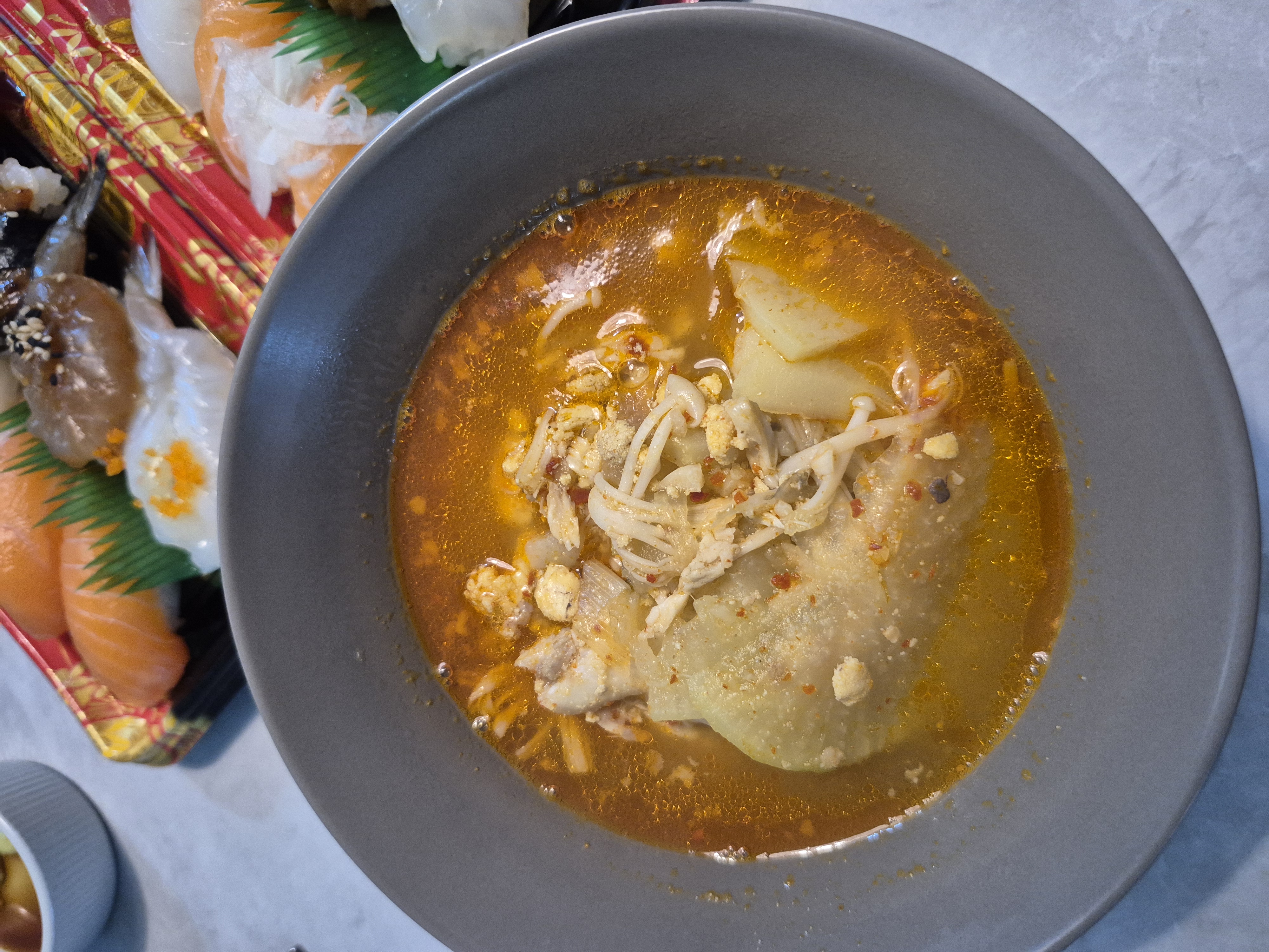 저녁거리로 매운탕과 스시를 사왔습니다