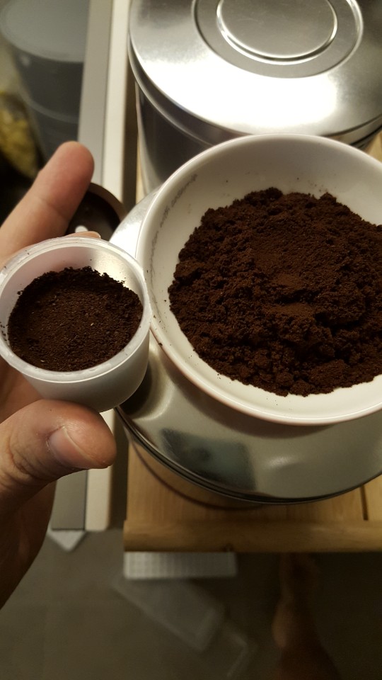 설명서에 보면 원두를 에스프레소로 갈아서 넣으면 압력이 너무 올라가 역류할 위험성이 있으니 알갱이를 그 한단계