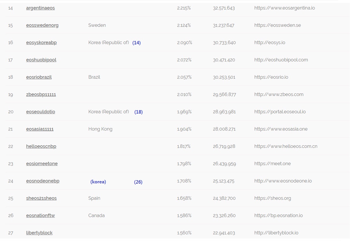 16일 12시 현재 이오스 bp순위 입니다.isseuboy (37)in #kr • 8 years ago (edited)하루만에 한국 bp 순위가 좀 변동이 있네요.. 이오시스와 이오서울은 두계단씩 하락 했고요.. 이오스노드원은 두계단 상승해서 잘 하면 21위 안에 들어올수도 있다는 희망을 갖게 되는데요..한가지 걱정은 이오스 노드원도 21위 안에 들어올경우에 한국이 3개의 bp를 21위안에 갖게 되면 다른나라에서 견제가 심하게 들어오지않을까 하는 걱정도 됩니다. 그러나 그건 그때 가서 볼 일이고 일단 이오스노드원도 21위안에 들어 오기를 바랍니다. 화이팅!! #eos #eosbp #bp #eosdac