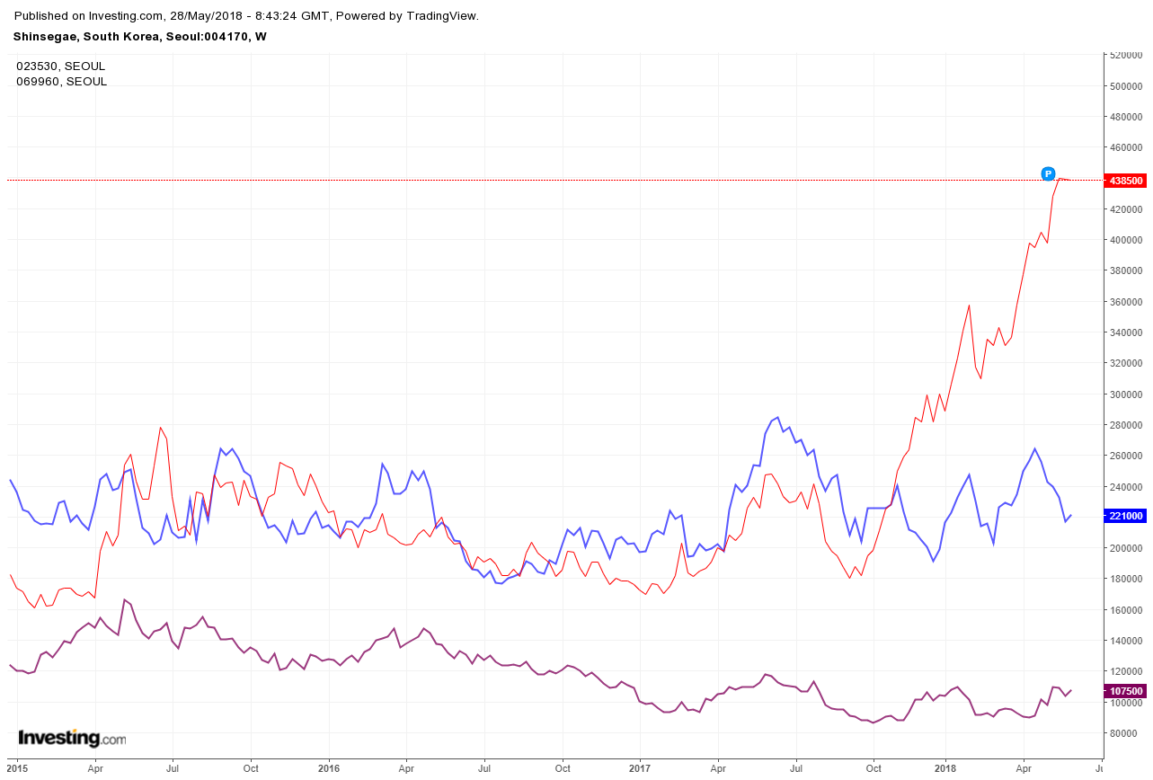 그랬던 곳이 지금은 정용진의 경영 전략이라할 수 있는 '고객의 시간을 잡아라'는 컨셉으로 오픈한 '별마당 도서관'이 다시 소비자들의 마음을 돌렸다네요. 우리나라의 대표적인 쇼핑몰(백화점) 브랜드인 신세계와 롯데, 현대의 백화점이나 쇼핑몰을 가보면 확연하게 차이가 나는거 같아요. 그런 차이가 아래에서 보는 것처럼 그 기업의 주가에도 반영되고 있는 듯 해요.(아래의 차트에서 빨간색이 신세계, 파란색이 롯데쇼핑, 보라색이 현대백화점) 개인적으로 느끼는 3사에 대해 한마디로 표현하자면, 신세계는 국내의 소비 트렌드에 주목해서 성공을 했고, 롯데는 중국에서 뒷통수 맞았고, 현대는 뭘하고 있는지 모르겠네요.ㅋㅋㅋ