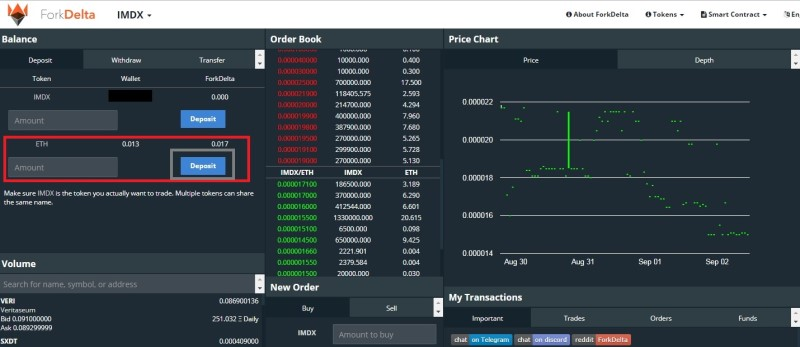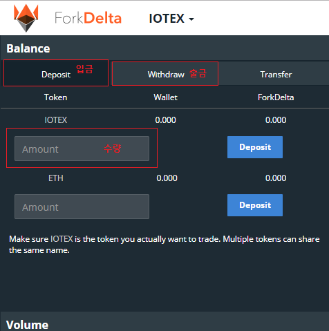 - 내 지갑에 있는 이더를 포크델타에 Deposit 합니다.(매수를 하기위해선 이더가 당연히 있어야 합니다.) Amount입력란에 수량을 입력 후 Deposit를 클릭 하면 자동으로 디파짓이 됩니다.