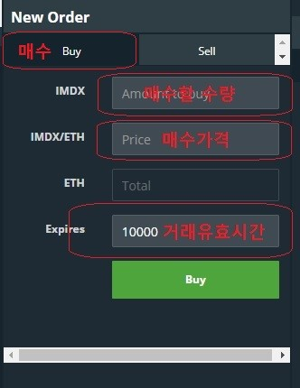 매수를 할 경우는 Buy를 클릭 후 매수할 수량과 매수할 가격을 이더리움 기준으로 입력을 하시면 되고,