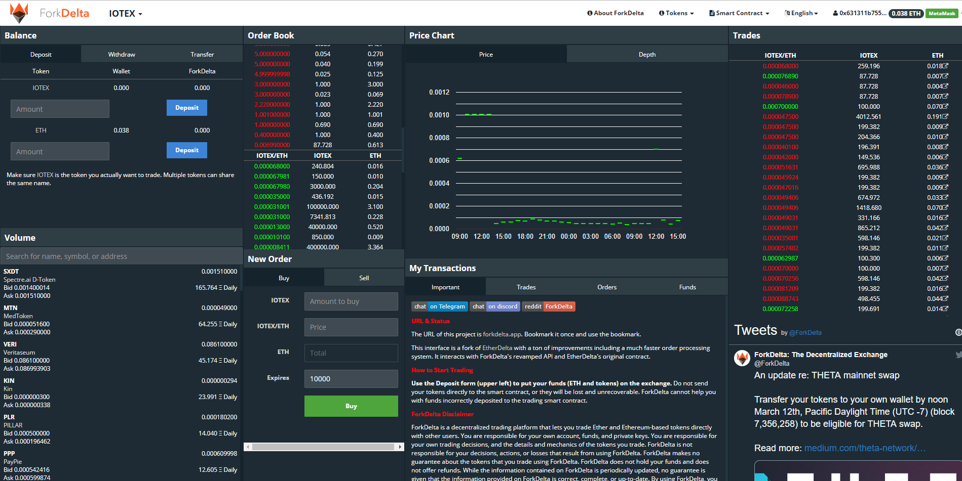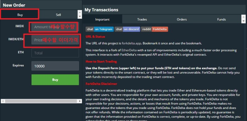 거래를 하기 위해선 일단 본인의 연동된 지갑에 매수에 필요한 이더리움이 있어야 됩니다. 그리고 본인이 매수할려는 토큰의 컨트랙트가 필요합니다. 그냥 리스팅 된 토큰을 골라 매수하여도 되지만 포크델타는 개인이 컨트랙트를 추가할 수 있기 때문에 본인이 매수할려는 토큰과 이름만 같은 토큰을 매수 할 수도 있기 때문에 직접 컨트랙 주소를 입력 후 수기로 찾아서 매수하는 방법이 안전합니다. 쉽게 얘기하자면 이름만 같은 스캠 코인을 매수하게 될 수 도 있다는 것입니다. 그렇기에 주의를 요합니다.