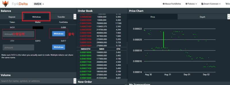 디파짓(Deposit)과 동일하게 Amount 입력란에 수량입력 후 Withdraw 클릭하면 자동으로 인출이 됩니다. 매수하고 남은 이더가 있다면 같이 Withdraw 하면 되겠습니다.