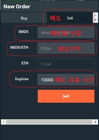 매도를 할 경우는 Sell를 클릭 후 매도할 수량과 매도할 가격을 이더리움 기준으로 입력을 해서 매도를 하시면 됩니다. 제일 밑에 위치한 메뉴 Expires는 거래 유효시간인데 기본설정되어 있는 상태로 매수 매도 진행하시기 바랍니다.