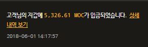 그 결과, 18.06.01 오후 2시 17분 경 5,326.61 MOC가 입금 되었군요.