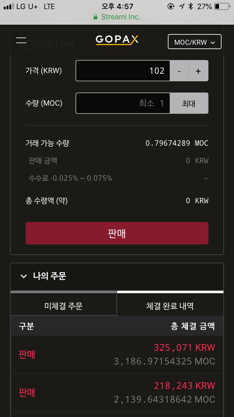 다른 일을 하고 있었던 상황이라 바로 대응은 하지 못하였고, 집으로 돌아가는 버스에서 가격을 확인하고 바로 팔았습니다. (MOC가 무슨 코인 인지 잘 몰라서 ㅎㅎ;)