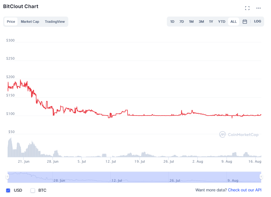 이전의 가격인 약 180 USD는 사실상 비트코인의 가격에 연동을 하며, 팔리는 비트클라우트가 많으면 많을 수록 가격이 자동적으로 올라가는 본딩커브식 가격 구조였다면, 이후 Bitcoin.com에 상장을 하면서 본딩커브 가격구조를 버리고, 발행량을 필스한 경우입니다. 이에 따라 시장에서 자동적으로 조정되는 정화된 가격은 현재 약 100달러선에서 매우 안정화된 횡보를 보여주고 있습니다.
