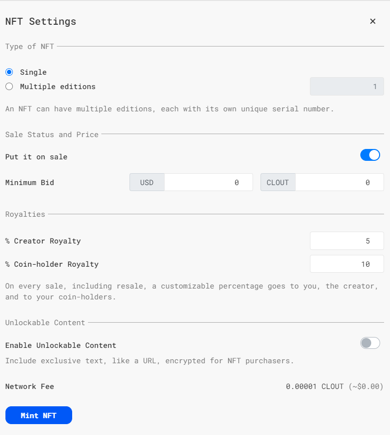 - Put it on sale : 판매를 위해 내놓을 수 있습니다. 최소 가격을 USD나 CLOUT로 정할 수 있습니다.