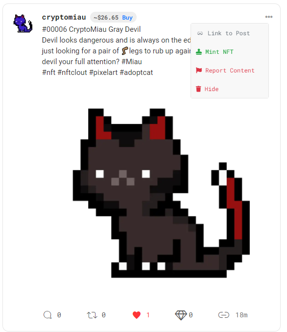 8월 초에 비트클라우트에 새로운 기능이 소개가 되었습니다. 이는 곧 포스팅한 클라우트를 클릭 한번으로 NFT로 전환할 수 있는 기능입니다. 즉, 소셜 미디어에 크레이터코인 + NFT 탑재 기능까지 완료한 것입니다. 필자가 실험적으로 운영하고 있는 @cryptomiau 계정의 NFT 생성 과정을 잠깐 살펴보도록 하겠습니다.