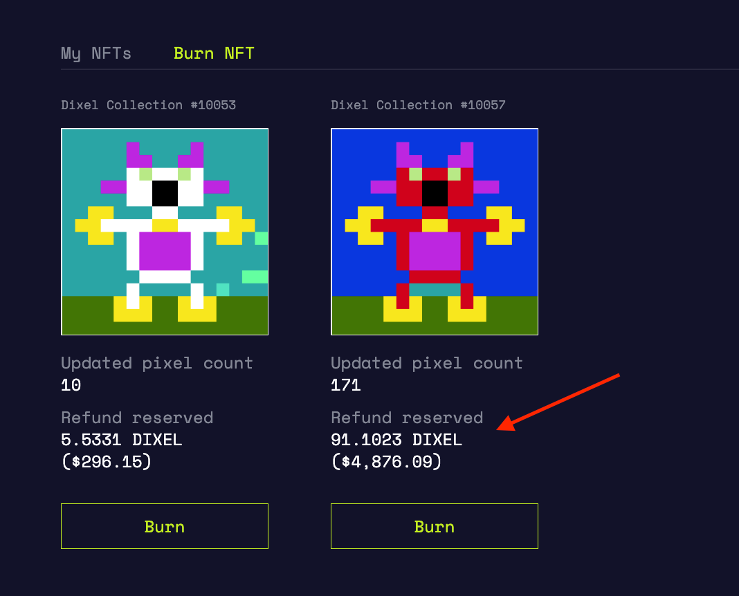 이때 재미있는 것은 각 생성되는 NFT의 최소값이 다 다르다는 것입니다. 구매후 소각시 생성비용의 90%를 돌려 받기 때문에, 시장에 혹시라도 저렴하게 나온 NFT가 재정거래 기반으로 거래가 될 수 도 있는 구조가 생성됩니다. 예를 들어 세컨마켓에서는 BNB로 판매되는데 딕셀 가격과 arbitrage가 충분히 생길 수 있습니다.