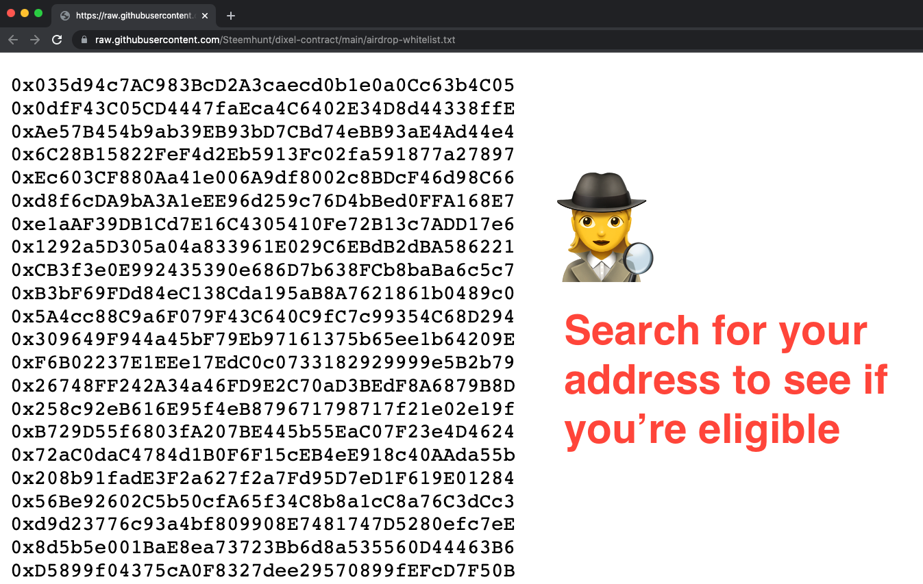 스냅샷은 이미 찍은 상태이며 최종 36,137개의 주소가 에어드랍을 받게 됩니다. 자신이 에어드랍을 받을 수 있는지 확인하는 것은 다음 주소에서 가능합니다.