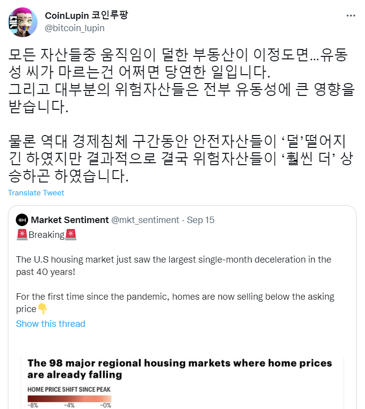 트위터와 텔레그램에서 활동하는 @bitcoin_lupin이라는 트위터 아이디를 쓰시는 코인루팡님의 경우는 거시경제의 흐름과 시장의 흐름을 통해서 포트폴리오의 shift 타이밍이 적절하게 선행되어서 관심있는 분들은 팔로우를 추천드립니다.