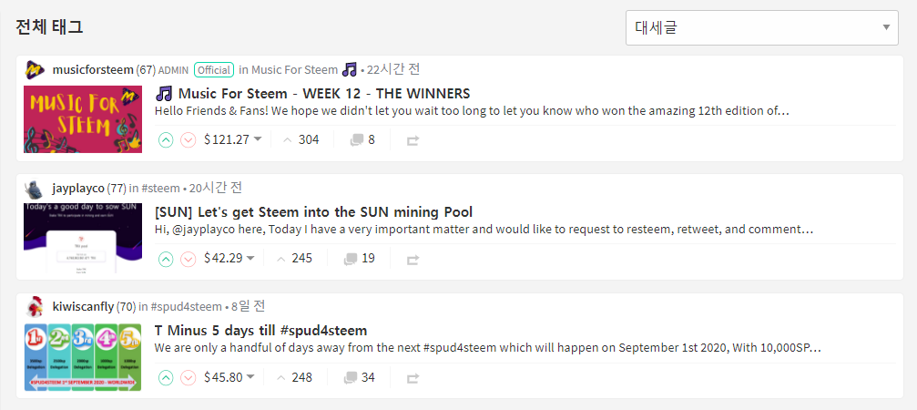 현재 영문 포스팅은 스팀잇재단측에서도 인지가 되어서 대세글과 NEW 최상단 2번째로 고정이 되어 있는 상태입니다. 확실하게 커뮤니티의 반응을 보겠다는 뜻으로 보입니다.