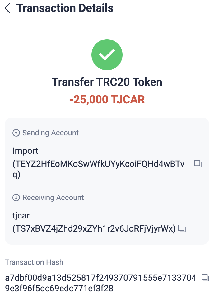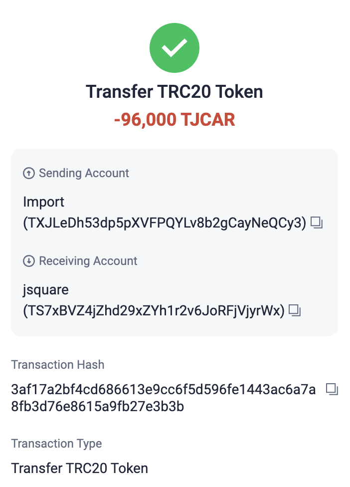 TJCAR 컨트랙트 주소 : TNHRQryXDyYSyqFHq8UqCYFSc6dzp81Dxa