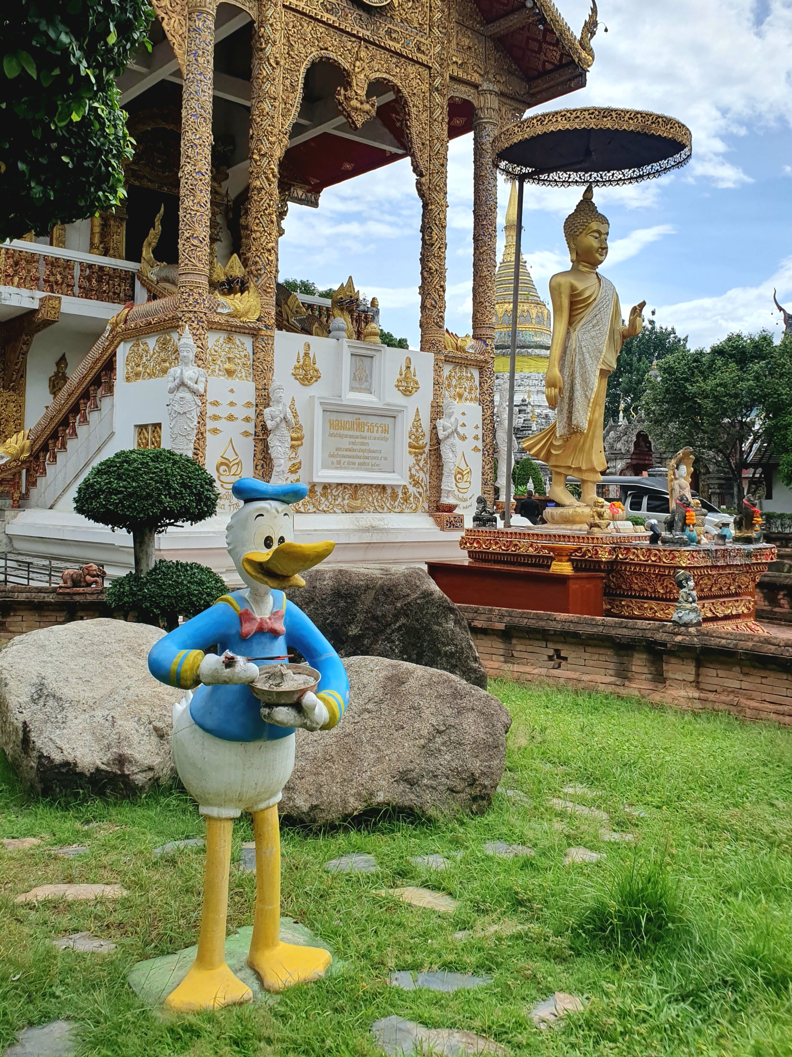 치앙마이에 온 지 2-3일쯤 되었을 때 와로롯 시장을 간다며 이 앞을 지나갔다. 사원 담장 사이 열린 문으로 뜬금없이 보이는 도널드 덕, 저 인형이 왜 저기 있을까 하면서 지나갔던 사원을 다시 찾았다.