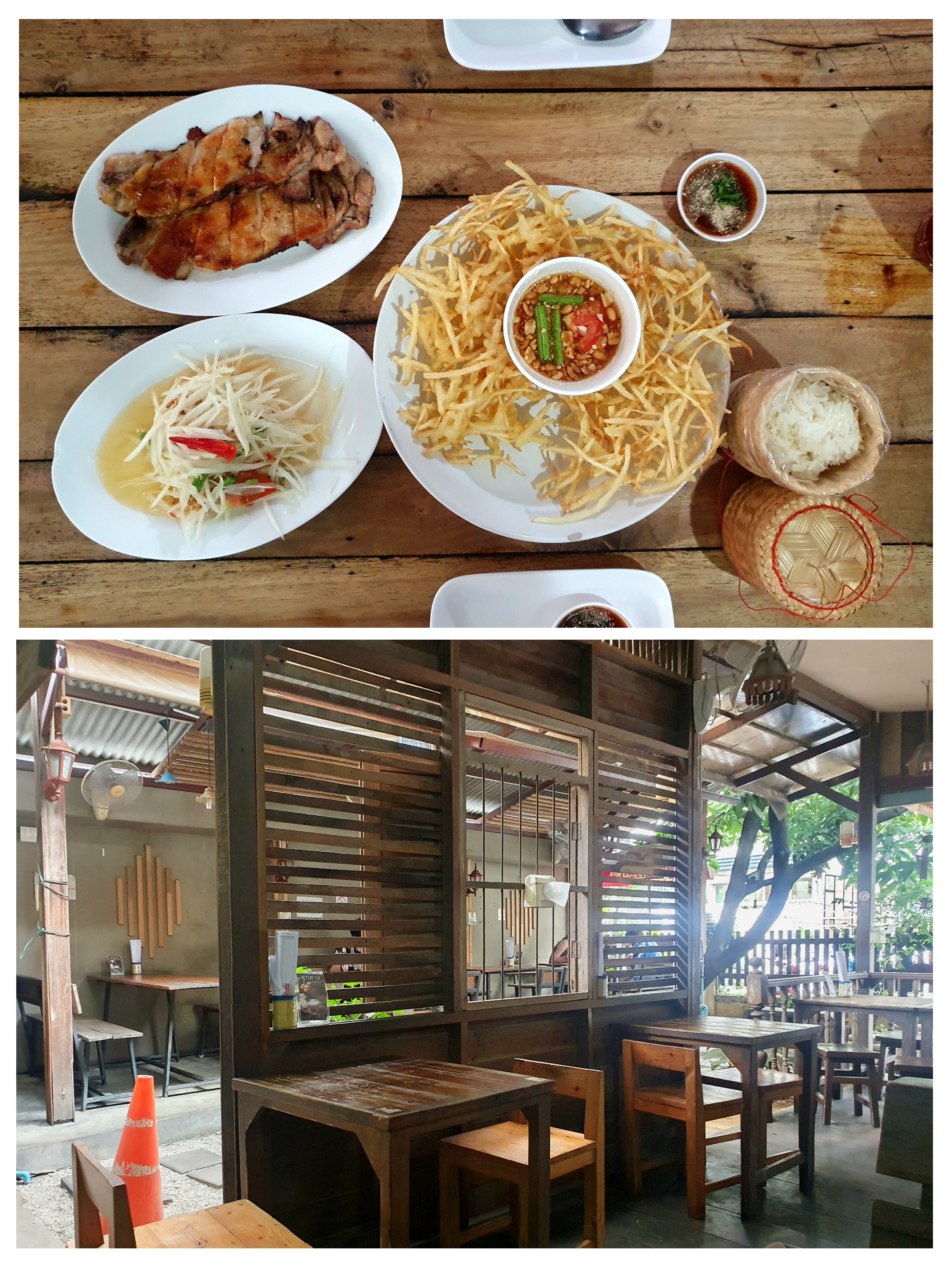 이미 많은 사람들이 다녀간 닭고기 구이가 유명한 집이다. 우리도 어김없이 1번 메뉴인 Crispy roast chicken 을 주문했다. 그리고 샐러드로 곁들일 쏨땀도 시켰다. 맛있었다. 특히 쏨땀은 이번 치앙마이에 와서 먹은 것 중에서 간도 제일 마음에 들었다. 가격까지 소박하니 좋았다.