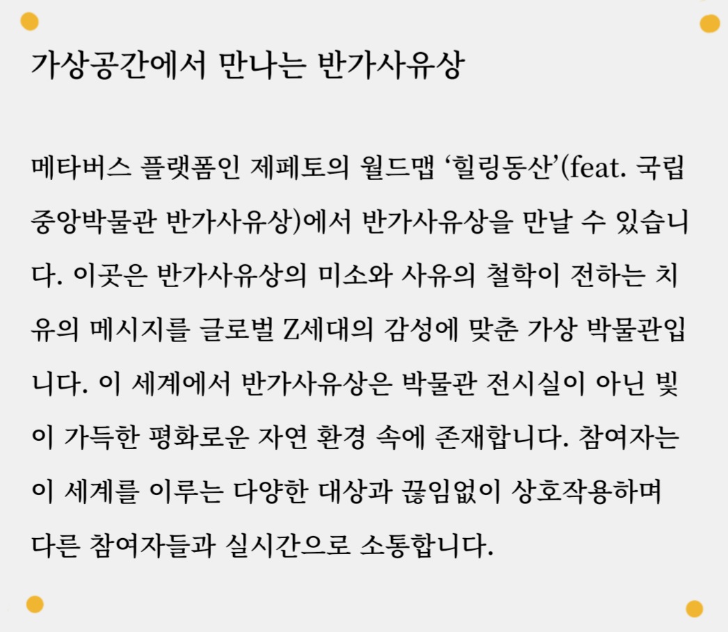 6세기 후반 그리고 7세기 전반 제작으로 추정되는 금동의 두 반가사유상은 언제 어디서 만들었고 어느 장소에서 어떤 경로로 발견되었는지 명확히 알려진게 없다고 한다. 그러나 부처의 미소를 보고 있으면 만든 이가 그 누구든 거의 부처의 깨달음에 가까이 다가선 사람이 아닐까 싶다.