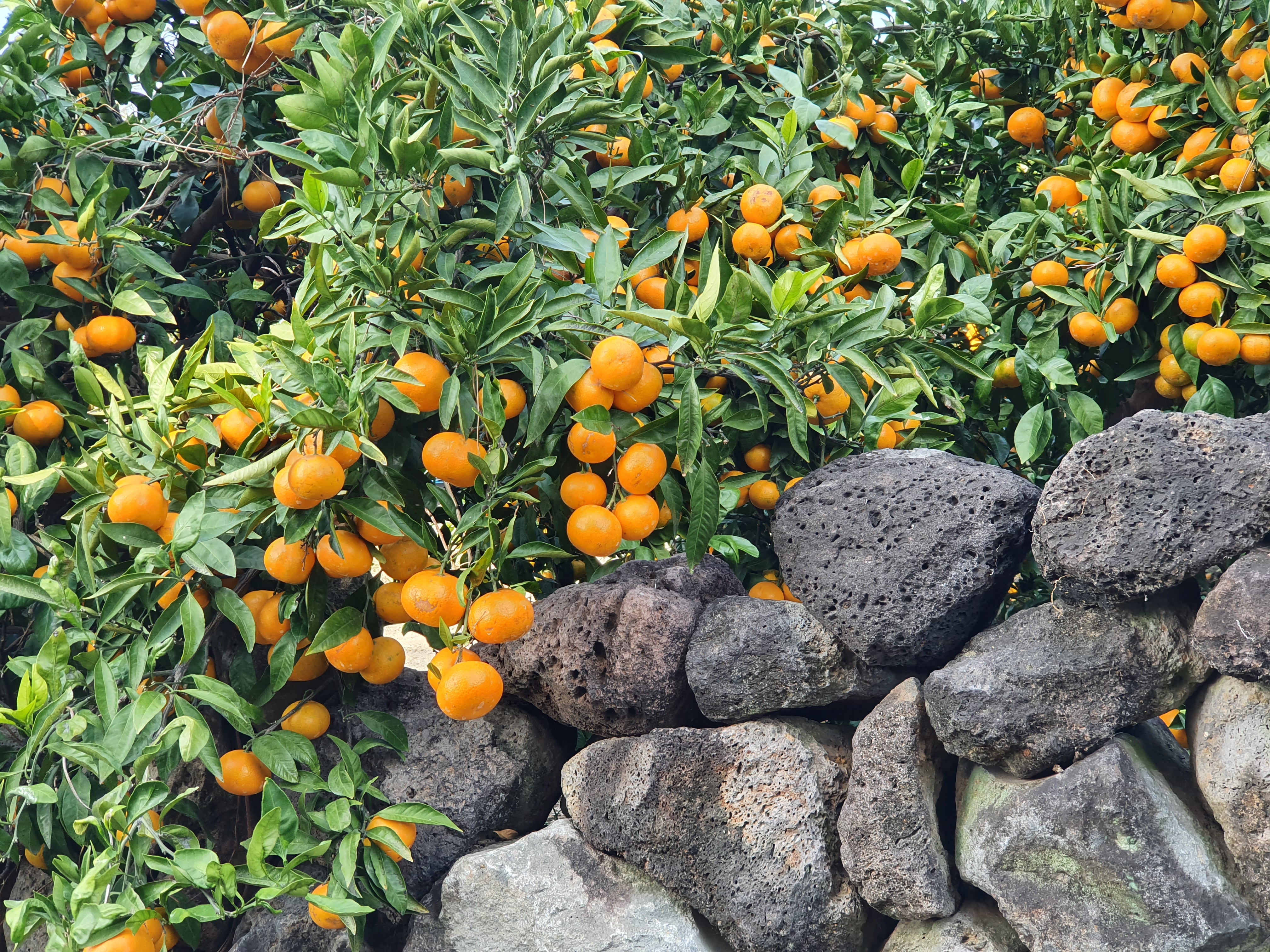 지금 제주는 귤밭이 가장 예쁘다. 오래전 얘기지만 귤나무 한 그루만 있어도 학생 하나를 학교에 보낼 수 있었다고 하는데, 무게를 감당할수 없게 가득 매달려 있는 귤이 돌담위로 흐르듯 넘친다.