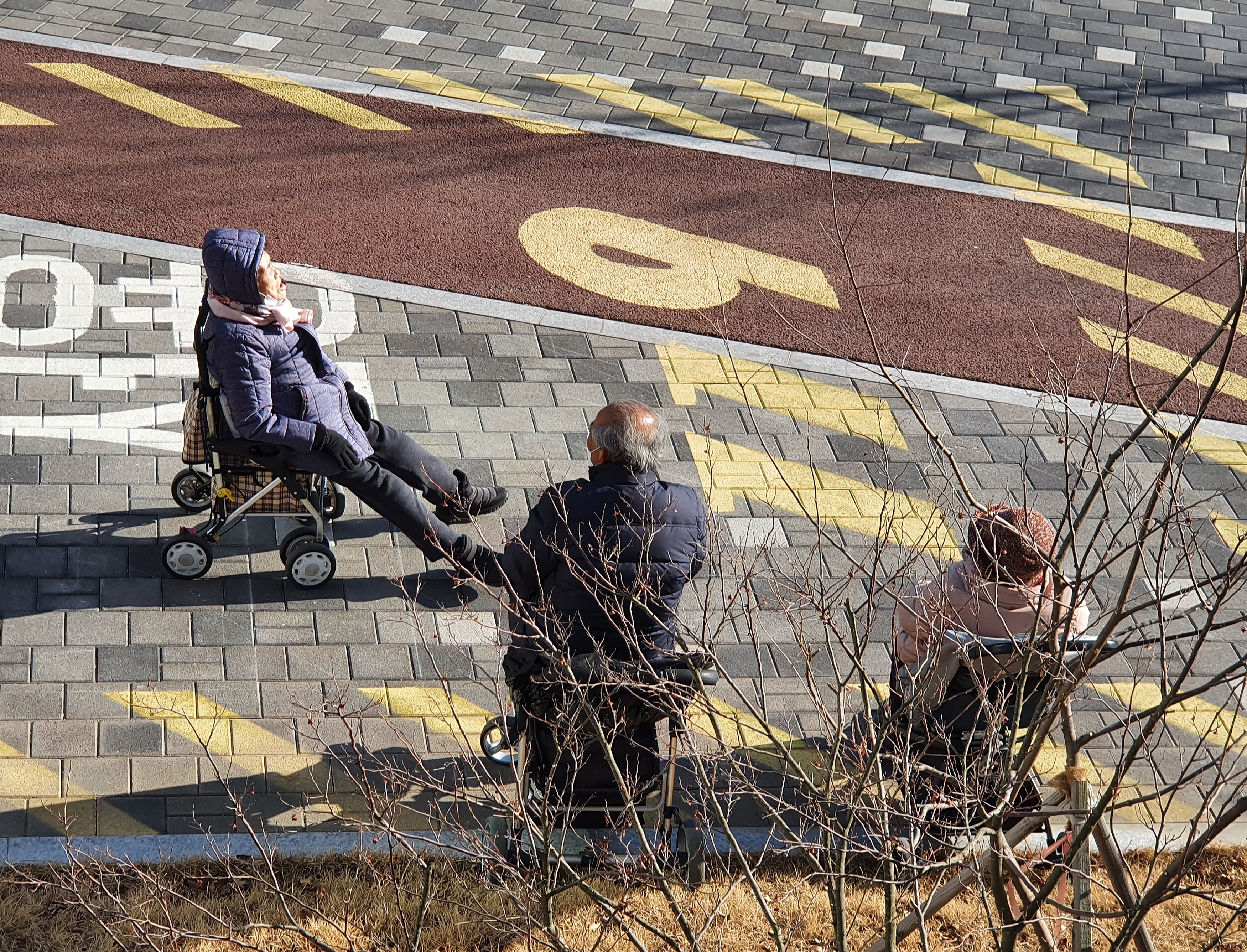 날이 조금 풀리고 한낮의 해가 좋은 틈을 타서 산책을 나오신 어르신들이 오다가다 잠시 쉬어갈겸 안부들을 나누시는 모양이다. 그리고 의자는 스스로 조달을 하셨다.