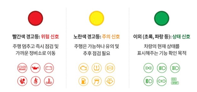 빨간색 : 위험 신호 이므로 주행을 멈추고 즉시 점검 및 가까운 정비소를 방문하도록 하자. 탑승자의 안전과 직결되는 위험신호이기 때문에 주행을 지속한다면 큰 사고로 이어질 수 있다.