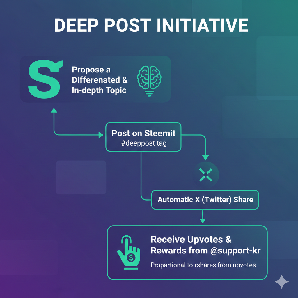—> 그렇다고 포기할순 없고… 다음과 같이 Deep-post 챌린지를 시작해보려고 합니다. 차별되고 깊이 있는 주제를 미리 제안하고 steemit에 포스팅할때 #deeppost 태그를 달면 X로 자동 게시됨. 또한 해당 스팀잇 포스팅은 보팅받은 rshares에 비례해서 @support-kr로부터 보팅과 상금을 받음. - 많은 분들의 참가를 바라며 별도의 포스팅으로 공지 하겠습니다.
