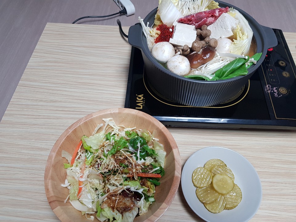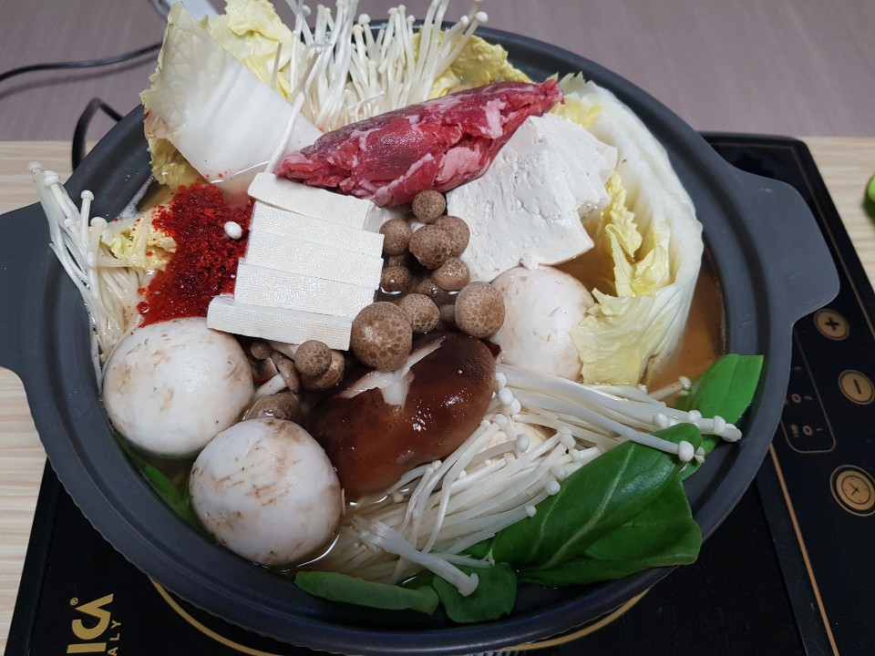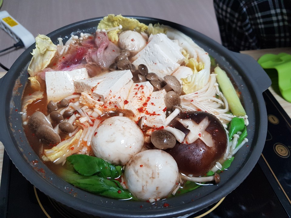 *재료: 소고기, 배추, 청경채, 찌개용두부, 표고버섯, 양송이 버섯, 팽이버섯, 만가닥 버섯, 고춧가루, 국간장, 다진마늘, 청양고추, 멸치액젓, 후추, 멸치 다시마등 우린 육수
