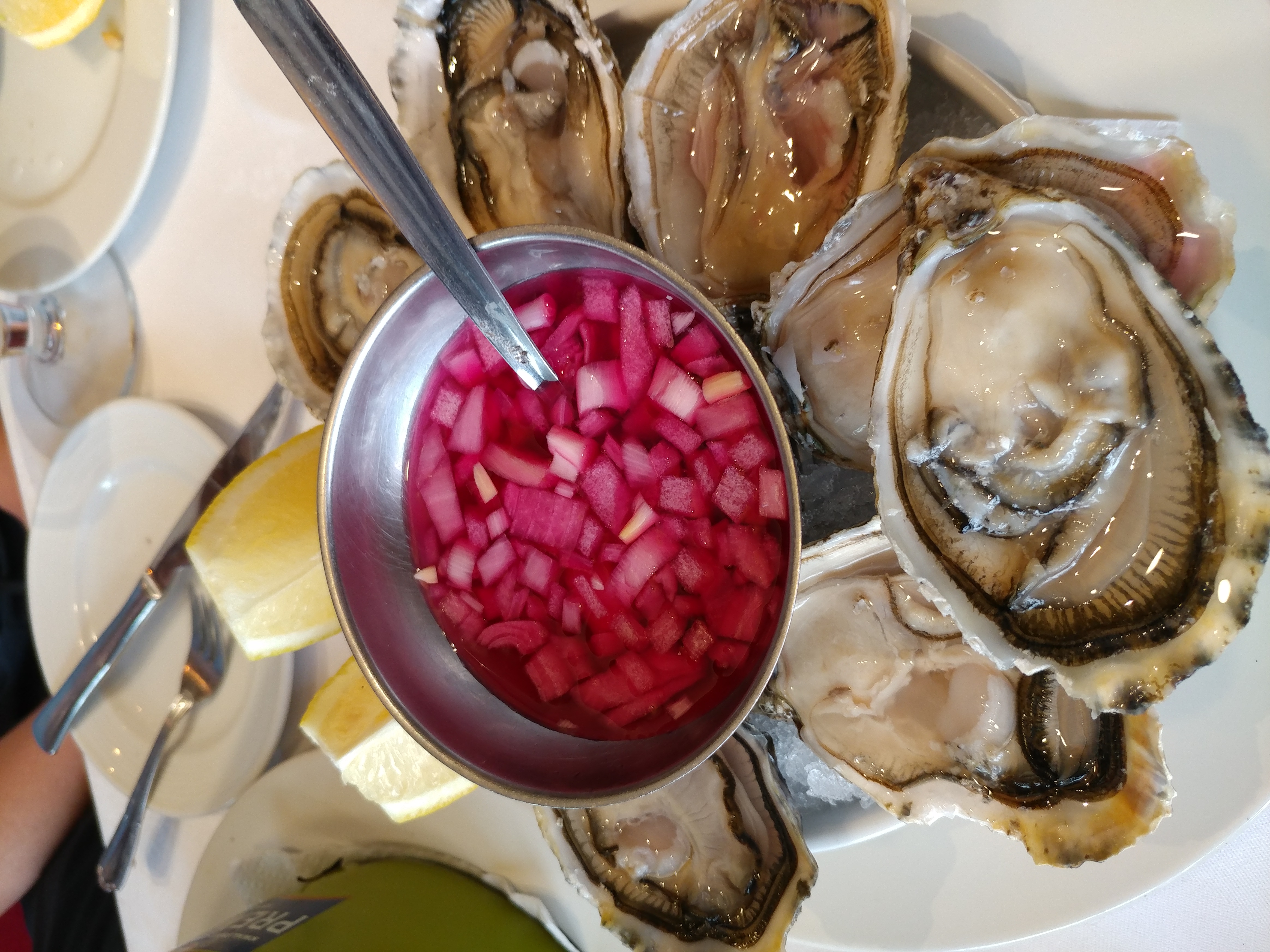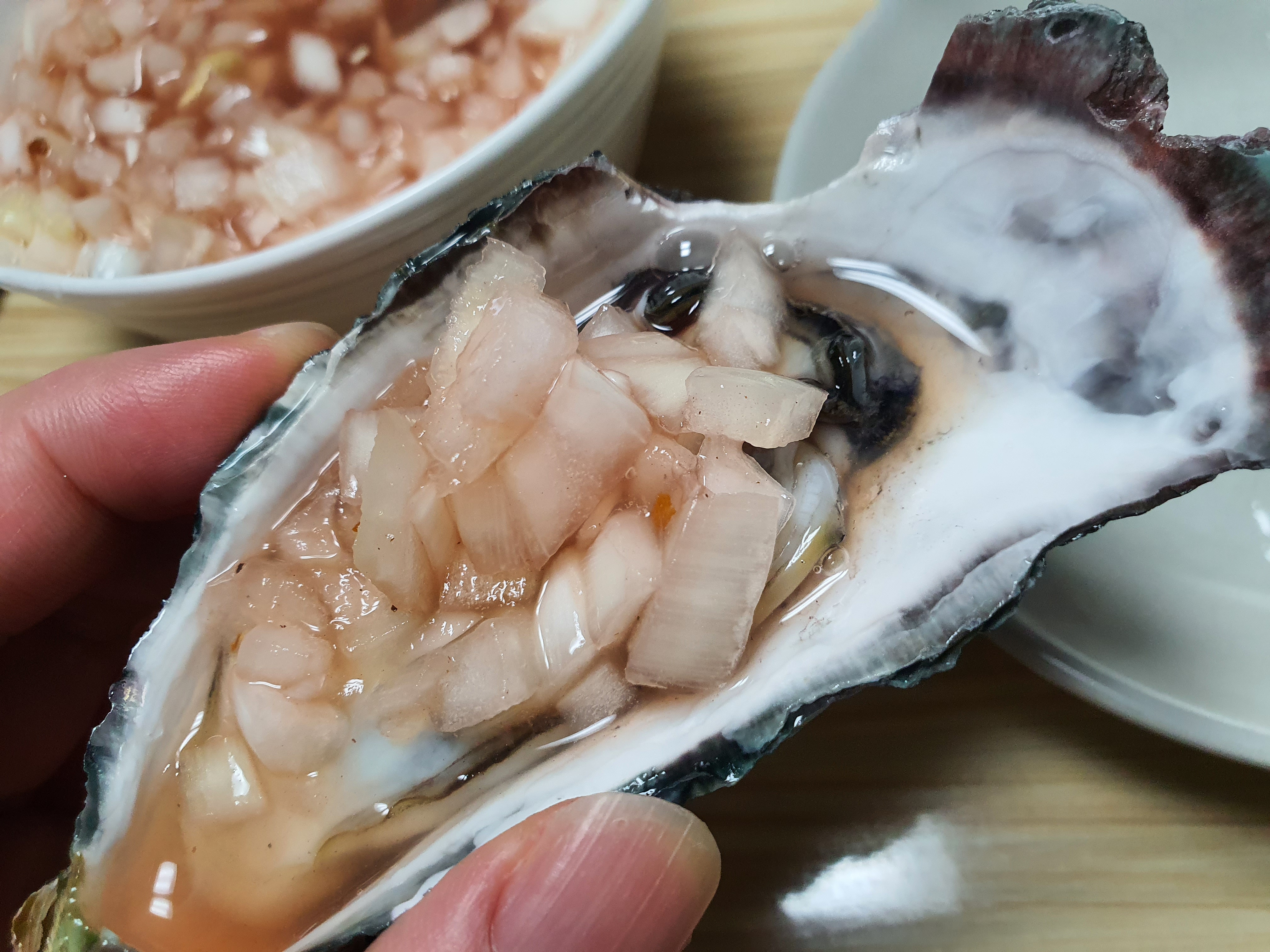 유럽 출장때 굴을 먹을 기회가 몇번 있었는데요 굴을 시키니 양파가 다져진 소스를 주더라구요.