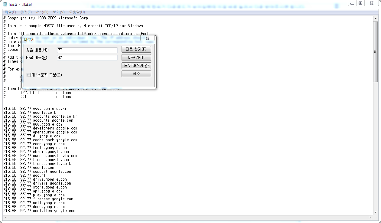 다른 숫자는 입력하시면 안됍니다. 혹시라도 자신의 메모장에 있는 IP주소에 끝자리가 77이 아닐경우 다수의 IP 끝자리가 같은 수를 찾을 내용에 입력해주시면 됍니다.