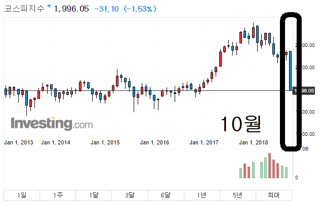 약 2년만에 코스피지수가 2000선 아래로 하락하였습니다. 특히 2018년 10월은 역사상 최악의 달이었는데요, 금융위기가 온것같은 차트입니다.
