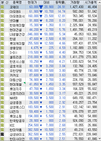 코스피 시가총액 상위종목들중 하락률 상위 종목들입니다. 웅진이 MBK파트너스로부터 코웨이를 인수한다는 소식에 코웨이 주가는 하루만에 -24.91%, 아모레퍼시픽의 어닝쇼크로 아모레G와 아모레퍼시픽은 -10%가 넘는 하락률을 보였고 심지어 방탄소년단 소속사와의 시너지가 기대되고 있는 넷마블의 주가도 -8%넘게 떨어지며 사상 최저가를 기록하였습니다.
