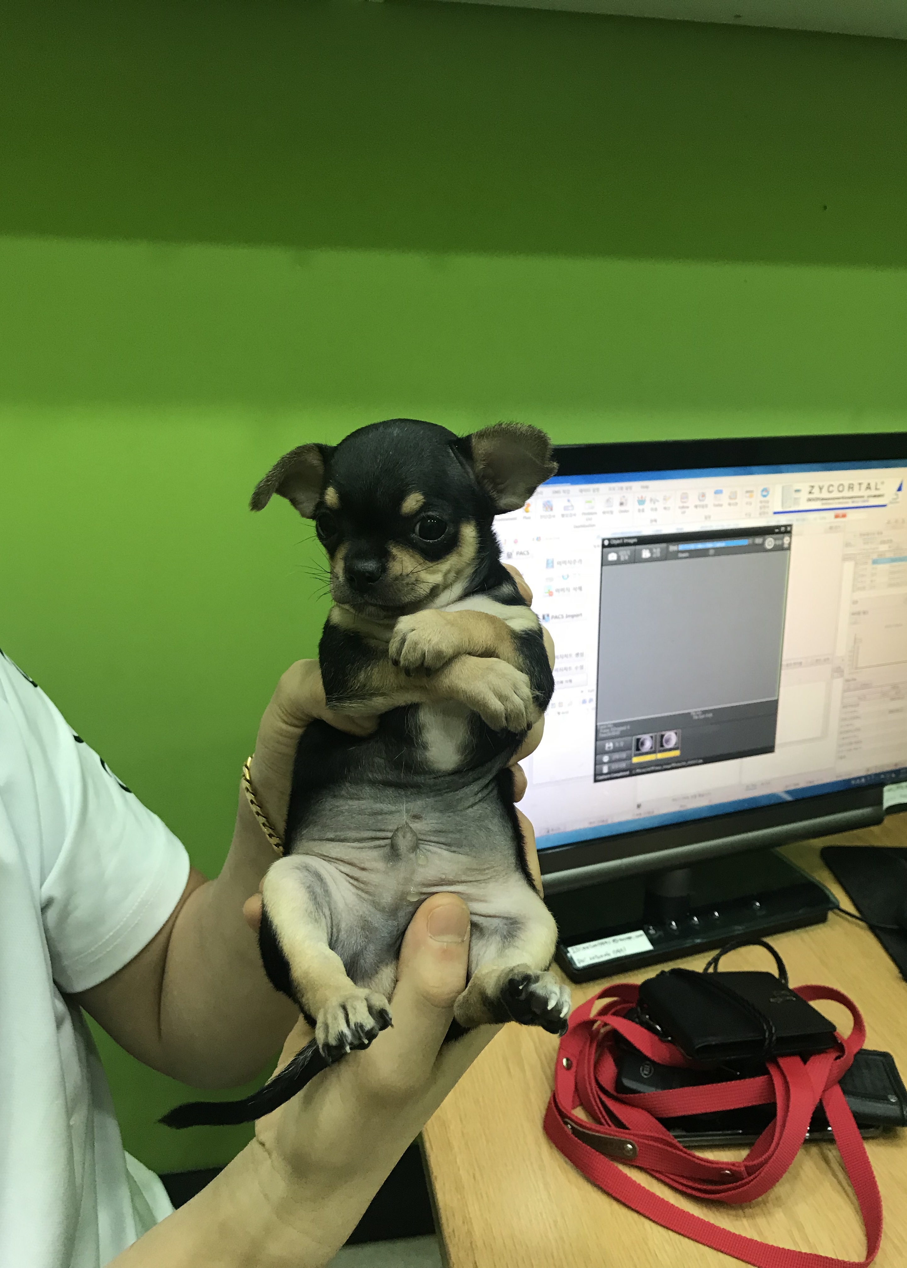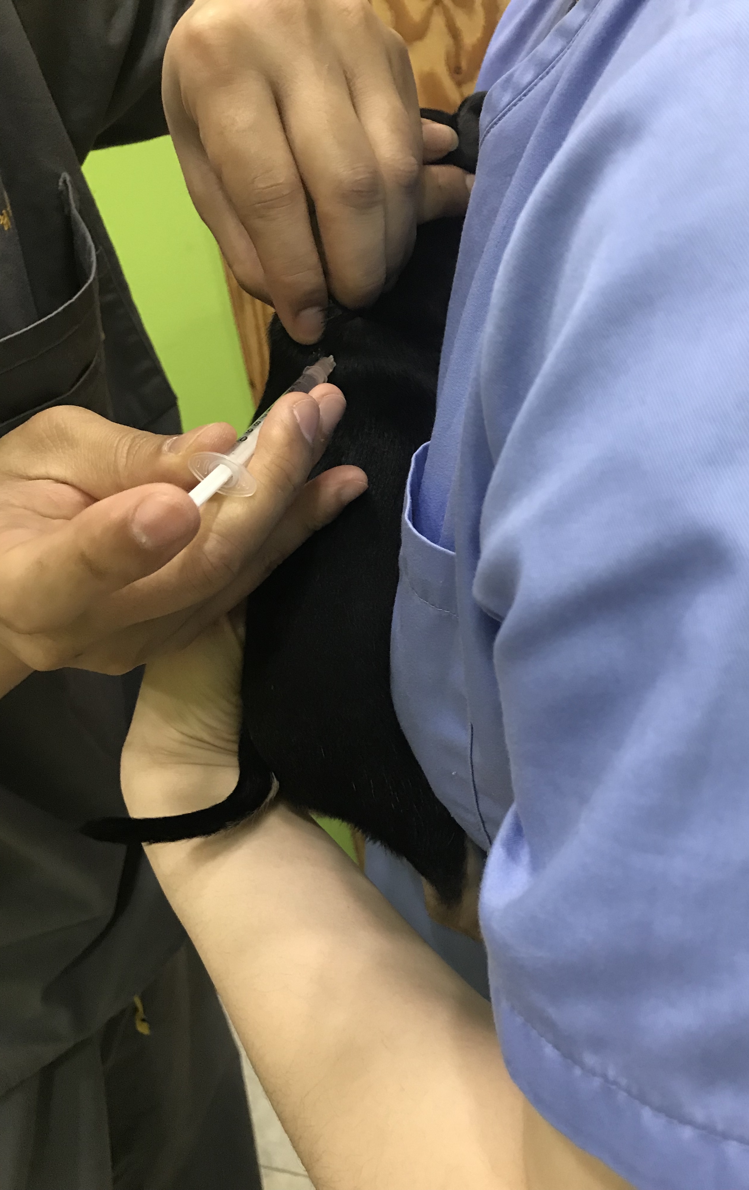 그렇게 둘째(토리) 차례가 왔고... 좀 안정시킨 뒤 예방주사 맞을 준비를 하는 토리의 모습이에요 ㅎㅎ