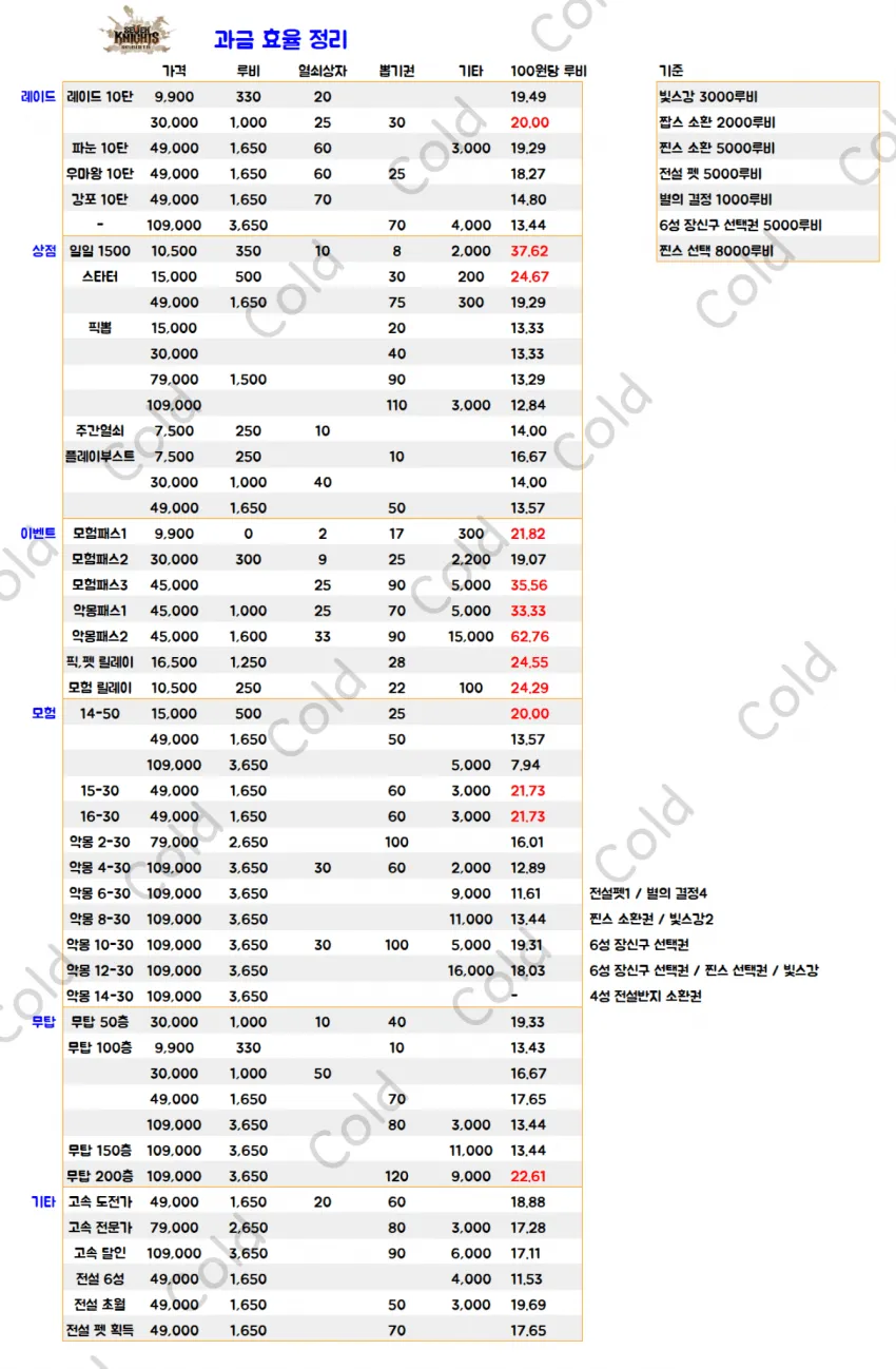 그래서 위와같은 표들이 유명 키우기 게임들에서 유저들이 정리한