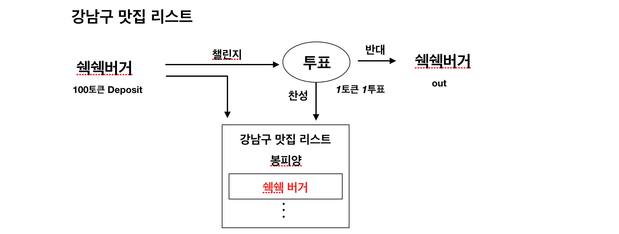 '강남구 맛집리스트'에 들어가고 싶어하는 강남의 맛집 쉑쉑버거는 100토큰을 deposit하고 리스트 허가 신청을 하게 됩니다.