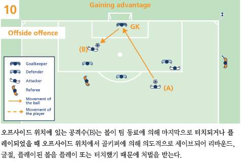그 공격수는 그 위치에서 사후에 이익을 보는 것이므로 그 터치 또는 플레이는 오프사이드 반칙이다.