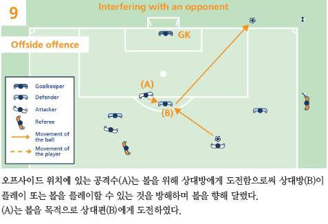 오프사이드 위치에 있는 공격수가 자신쪽으로 패스되는 공을 향해 움직인다면 상대 팀 선수를 방해할 수 있다.