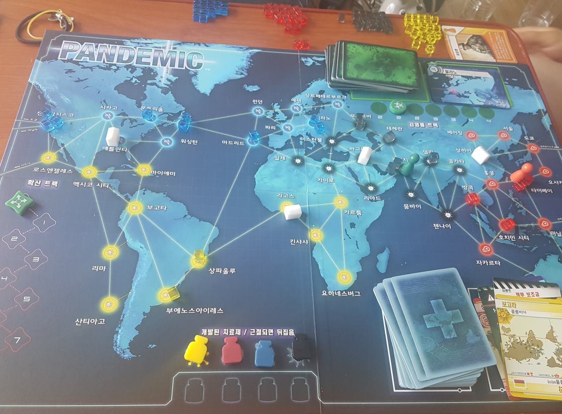 누가 지고 이기는게 아닌 플레이어 전부가 협력해서 질병을 물리치고 지구를 구하는?! 게임입니다.
