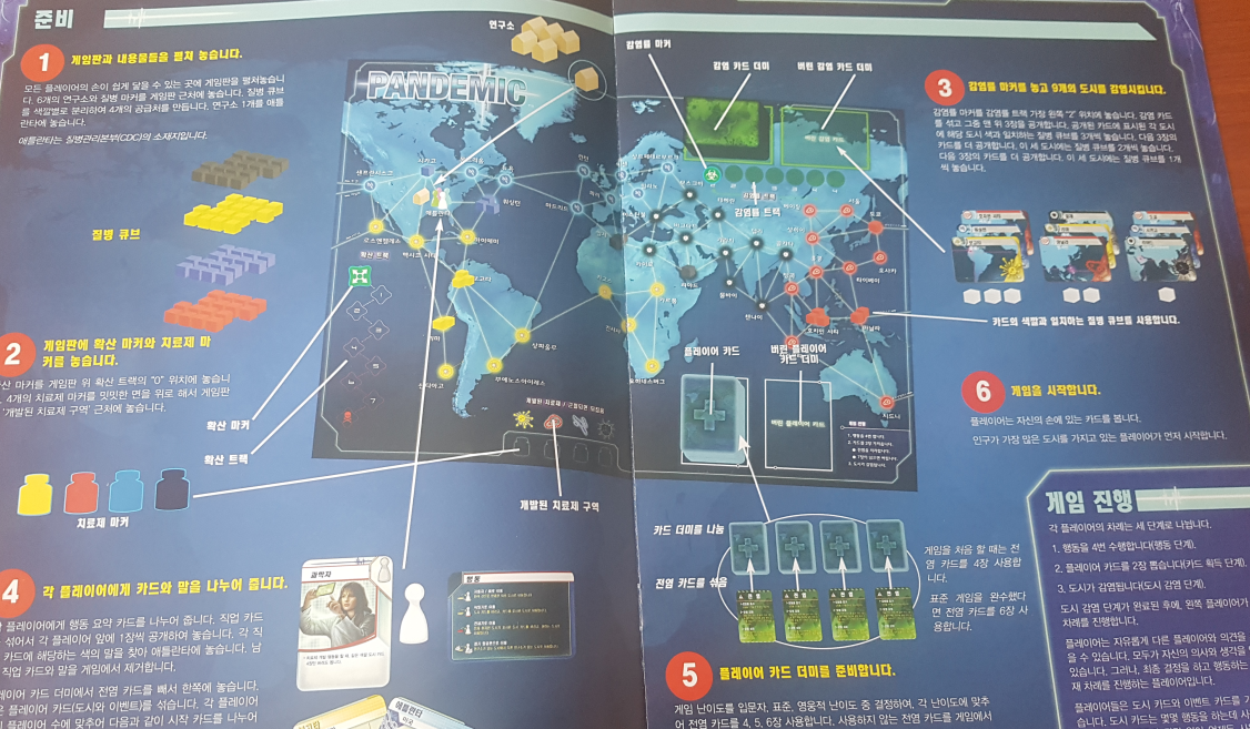 처음 뽑은 3장의 감염카드로 질병큐브 3개씩 감염, 두 번째 뽑은 3장의 감염카드에는 질병큐브 2개씩, 세 번째에는 한 개씩 - 각 플레이어가 카드와 말을 나누어 가집니다.