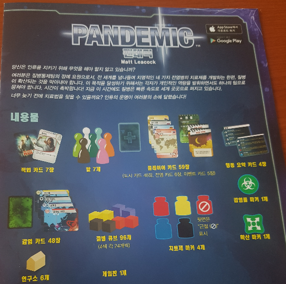 - 플레이어 카드 59장(도시 카드 48장, 전염 카드 6장, 이벤트 카드5장)