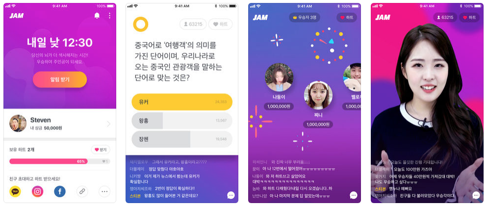 스노우에서 만든 참여형 퀴즈 영상플랫폼. 매일 약 15분간 12문제의 퀴즈를 풀게 되는데, 전부 맞춘 사람들이 스테이지에 걸린 상금을 나눠갖는 시스템이다. 직접 참여해보니 평일 기준 약 8만명이 동시접속했었다. 퀴즈에 대한 힌트를 인스타그램과 페이스북 등 여러개 채널에서 참여율을 극대화 시키는 전략을 취하고 있다. 기업과 연계한 참여형 마케팅 프로그램이 기획되어있고, 최근에 사용해본 서비스중에 재미와 상업성 둘 다 잡은 케이스가 아닐까 생각했다.