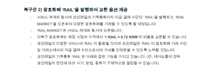 코인레일 거래소는 해킹 피해 복구안 중에 하나로 자신들의 거래소 자체토큰 레일을 발행한 다음 1 rail의 가치를 0.72원으로 간주해서 피해를 복구해 주겠다고 제안했습니다.