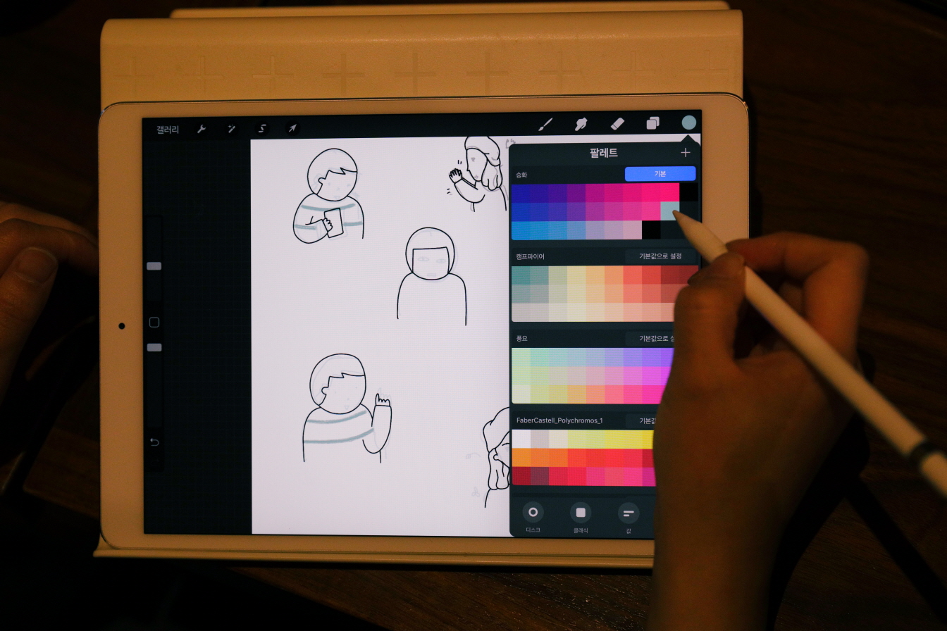 아이패드에서는 프로크리에이트앱으로 그리고, 후작업 (타이핑 & 배치 등등)은 포토샵으로 하고 있습니다 ^^