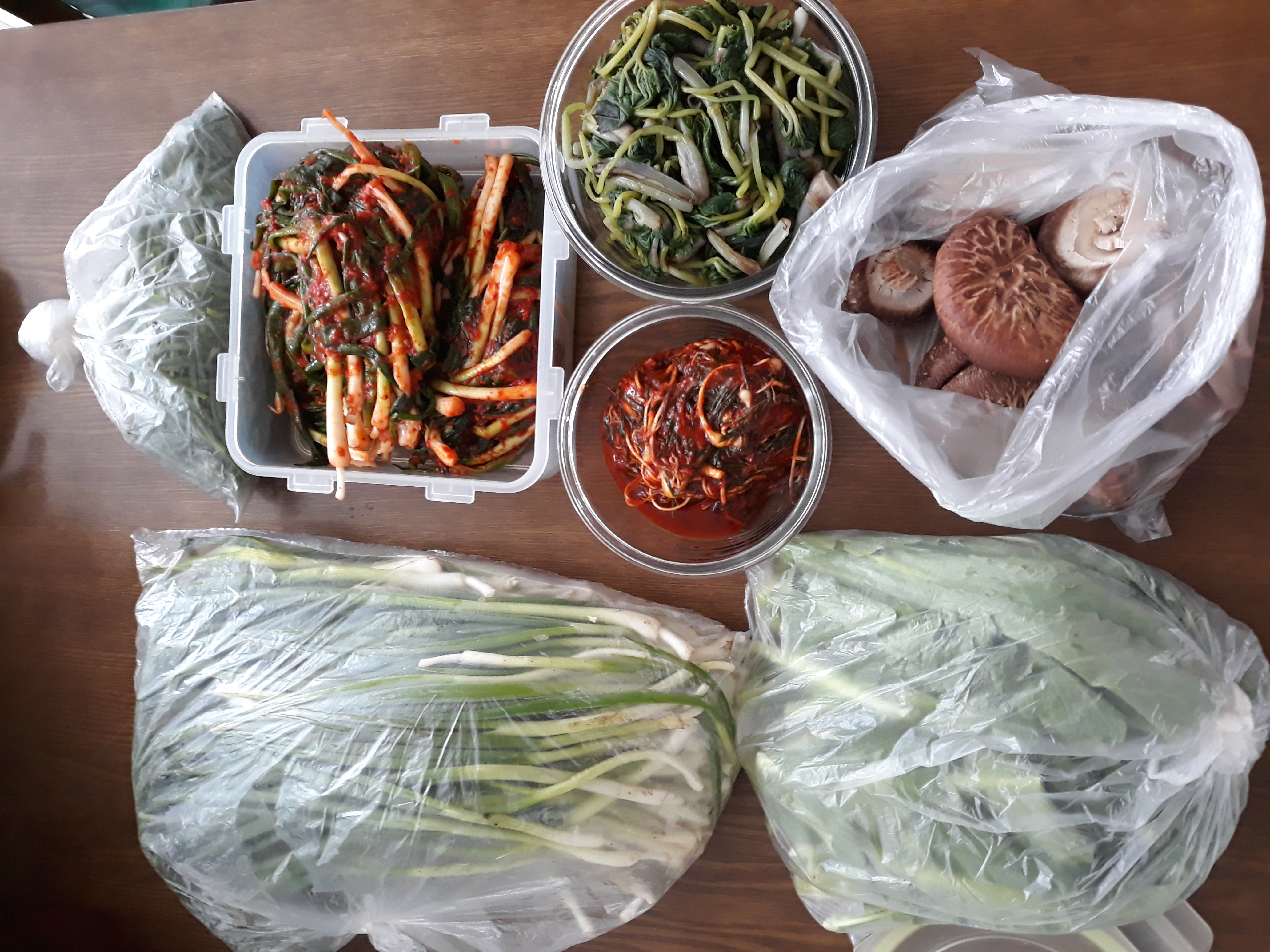 달콤한 달래무침/ 쌉싸름한 머위 데친 거 / 두가지 양념맛의 파김치/겨울초/ 송화버섯 / 초벌부추