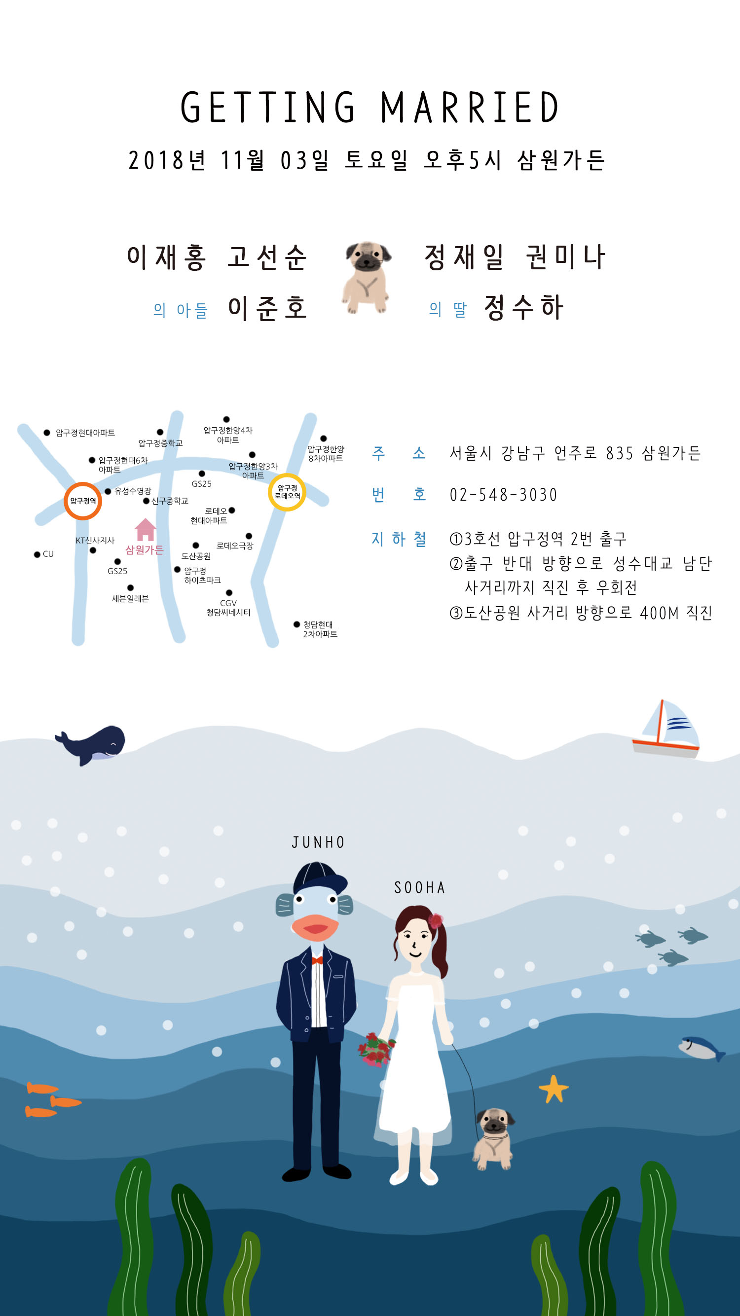 믿고보는 송이님의 청첩장디자인!! 이지만 물고기가 되어버린 신랑에 잠시 감정이입해서 아가미가 난 기분이 들었습니다 ㅋㅋ